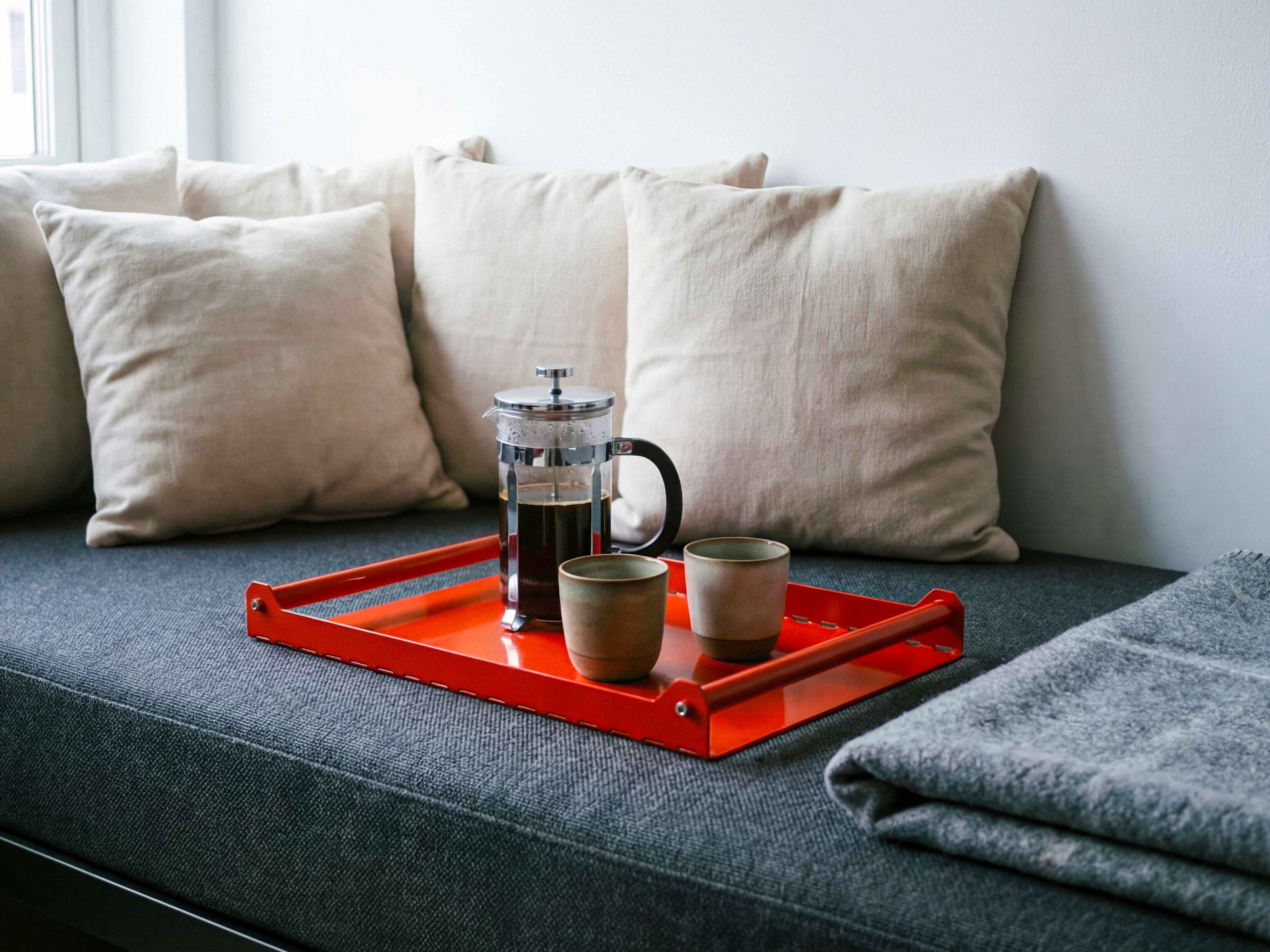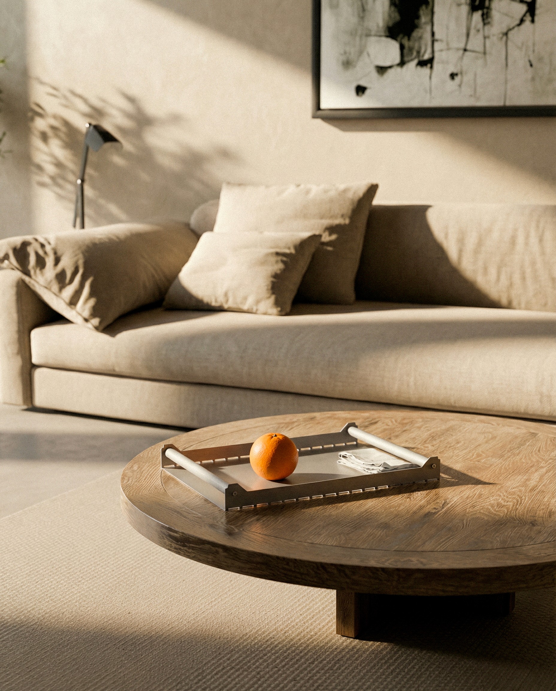 Skarp Tray is a robust serving tray in aluminum, available in a range of colors. Its removable handle makes it easy to adapt to different uses — from serving to display.
